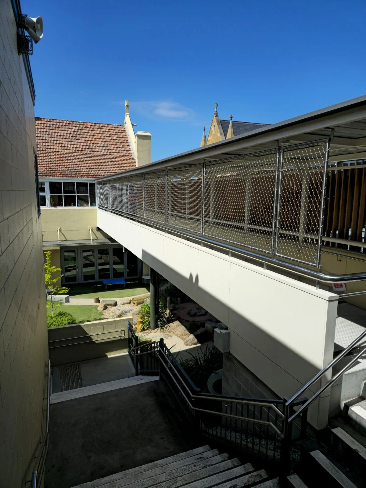 Air Walk featuring stainless steel wire mesh panelling and stainless steel handrails installed at St Virgil's College primary school campus.